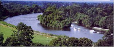 Upstream of Mortlake are the Royal Botanical gardens at Kew Then it is on past Ham House (below centre) a 17th century mansion, and the wide open spaces of Richmond Park (below right) and its 2400 acres of open land, herds of deer, rhododendrons and many other natural delights And beyond Richmond Park you come to Wimbledon, centre of the tennis world every July for the Championship. |